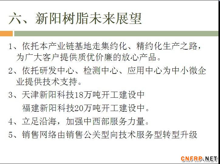 在未来规划中,新阳科技将依托产业链基地走集约化、精约化发展道路,为客户提供质优价廉的放心产品,因为市场需要,新阳科技在天津、福建各有18万吨、20万吨的树脂项目在开工建设中。期待新阳明天更美好!