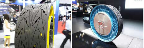 左图为住友橡胶展出的GYROBLADE轮胎,右图为普利司通“非充气轮胎”