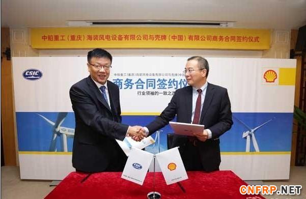 2015年11月4日,重庆讯,中船重工海装风电设备有限公司(以下简称海装风电)与壳牌()有限公司(以下简称壳牌)在重庆举行了新一轮合作签约仪式。现场,海装风电总经理孙建中和壳牌大陆及香港地区润滑油业务总经理沈坚一同签署了为期两年的商务合作合同,并握手承诺:在接下来的两年内,壳牌作为重要的风电油品和润滑脂供应商,将为海装风电提供风电初装和相应的服务用油,同时壳牌也会继续提供高附加值服务,如配套的润滑技术服务及知识培训,帮助海装风电建立风机运行管理手册,定期举行现场问题分析解决会议、联合品牌推广等。
