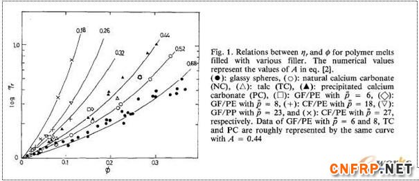 (Ref: An empirical equation of the relative viscosity of polymer melts filled with various inorganic fillers, T. Kitano, T. Kataoka, and T. Shirota, 1980)
