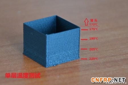 经过测试比较,当温度高于205℃表面会粗糙变形,当温度低于175℃时耗材不易融化发生断丝。