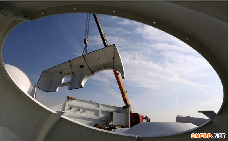 11月16日,两台吊车在新疆哈密中复连众风电装备制造基地吊运刚下线的风叶。