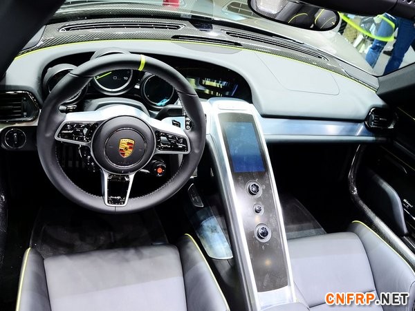 保时捷918内饰方面:除了笼体车舱结构之外,在车顶、尾翼、后视镜、内装饰板甚至是挡风玻璃框架上,都采用了碳纤维复合材料,这样918 Spyder仅有1,640公斤的车身重量,保证了其操驾上的轻量化优势。