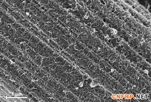 而且,SP Nano 已经证实了SP1/CNT可以被用作像胶水一样的涂层来干燥碳纤维在载荷为0.3-0.4%时。SP Nano用酚醛树脂法通过湿法和压蒸法测试了这种材料,并将得到的结果与没有SP1/CNT涂层的碳纤维与酚醛树脂的混合实验进行比较,结果显示SP1/CNT混合物的层间的剪切强度比没有混入SP1/CNT的材料高47%,通过厚度拉伸强度测试说明混有SP1/CNT的复合物增加了176%。SP Nano 声明性能的改善是由于在碳纤维表面存在碳纳米管,这可构建一个高密度的网状结构,从而连接了纤维与树脂基体。