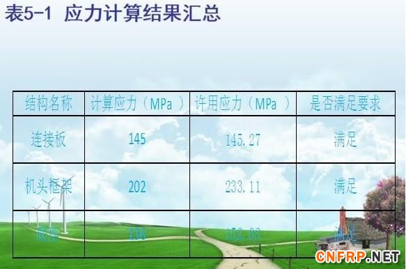 图5-1为连接板的应力分布云图,大等效应力为145MPa, 图5-2为机头框架的应力分布云图,大等效应力为202MPa,图5-3为底座大应力分布云图,大等效应力为136MPa,各结构件应力结果汇总。