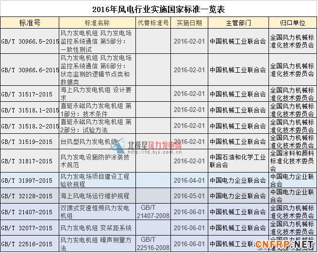 另从国标委2015年行业标准备案公告中获悉,风电产业相关的行业标准已在2015年全部实施,截至目前2016年并无新的行业标准要实施。