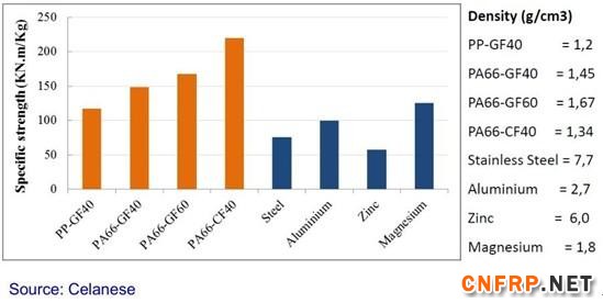 玻纤增强热塑性复合材料与金属材料比强度的对比: