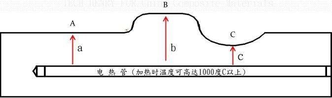 传统的电热管加热,它会有A、B、C不同温度的温度差,只能控制到A点或C点。热源由模具内部向外热传导扩散;模具越厚加热时间越长;因电热管因素模具无法变薄。