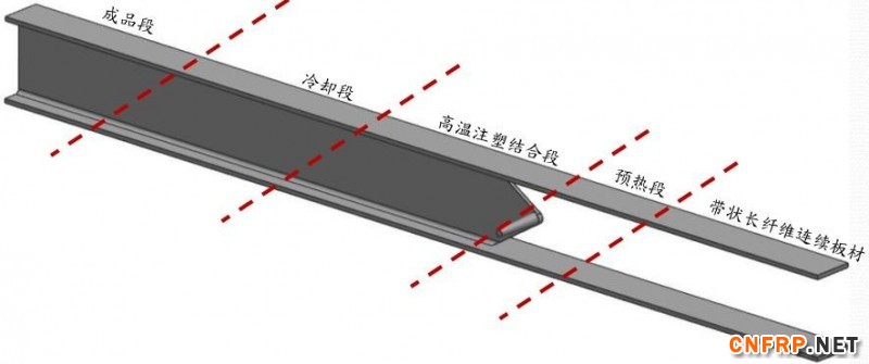 拉挤+押出1/3:热塑复材拉挤可灵活搭配运用复数工法,以制作出符合要求之成品外观及结构,下面范例系以长纤维连续板材+短纤维注塑押出方式,制作出工字梁之范例。