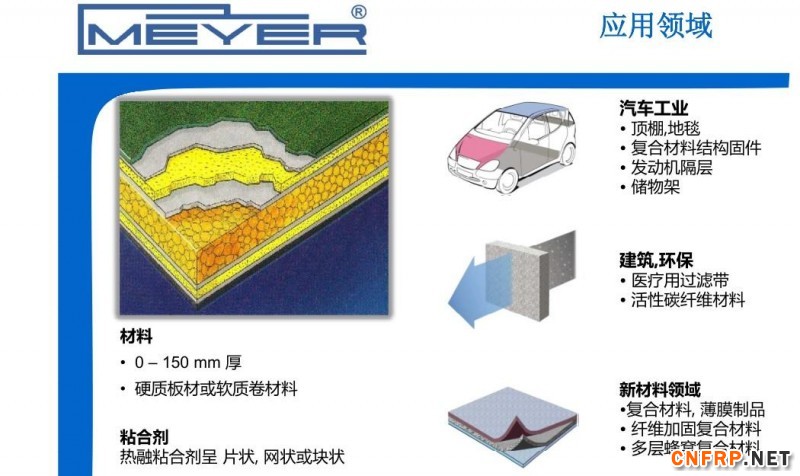 汽车是先应用这些复合材料的,像汽车顶板,发动机的隔音罩,还有一些车箱的内饰板。新开始应用这些板材也是随着德国大众与的合作开始。当年桑塔纳进入的时候,有一些配套的厂商,他们使用了一些复合材料的顶板和内饰的设计,正是理念随着德国大众进入,把这些理念带入到我们的市场之中,当然随着二、三十年的发展,这个理念已经突破原有的限制,有了新的高度,然后近几年像建筑和航空航天领域的应用正在逐步增多,尤其是在国内,这个从业务的发展上能感觉出来。