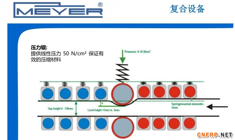 从简单的服装粘合到今天复合材料的复合,整个的生产线的研发都是随着客户要求的提高而逐步发展起来的。这个宽幅3米的复合压机,是按照客户要求独立研发的。这个宽幅3米的压机真正的技术难度是所有横截面上的加热、加压的这些滚轮也好,原件也好,我们通过各种,包括材料的配比,我们可以达到在250度工作,连续进行24小时的情况下,可以做到整个材质的变形率不超过0.1mm。能达到这个数值和这个宽幅目前在全设备供应商中,只有迈亚公司暂时能够达到,因为迈亚公司很多材料的在里面提供了很强有力的支持。