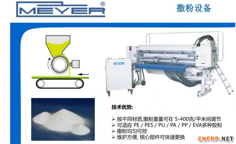 为了设备研发,为了产品和理念的进步,迈亚公司专门有一个生产车间留了一套全套的生产设备,有送料系统,加热、撒粉、加压,包括复合,整个的生产线就在工厂后面的车间里面,这个其实是发展的核心,也特别希望对技术有兴趣的同仁拿材料一起进行测试,在这个实验室的工作人员已经与许多欧美的客户共同地生产,他们是非常有经验的,我们可以共同地探讨。
