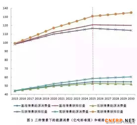 在基准情景下,的碳排放目标有可能实现。预计 2025 年,化石能源二氧化碳排放总量近 120 亿吨,并达到峰值。到 2025年左右达到峰值的原因在于:持续的能效提高和风能、太阳能、水电和核电等低碳能源使的排放增长放缓。特别是,将在 2017年在范围内引入碳交易机制,执行强制性的能效标准,以及提高低碳能源使用都将促成这一目标的实现。然而预计截止 2030 年,能源消费未达到峰值,但是已经增长非常缓慢,2026-2030 年能源消费总量平均增长率为 0.0065%。能源消费总量约为 54.6 亿吨标准煤,尚未达到峰值。