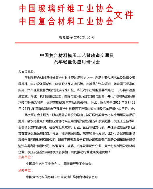 压制类复合材料是纤维复合材料主要制品种类之一,产品主要包括汽车及轨道交通零部件、电力设备零部件、建筑卫浴及人造石等。尤其是在汽车领域,随着国五标准的实施,汽车轻量化作为应对排放标准升级、降低汽车油耗的重要策略之一,必将加速推进实施。为此,我们要主动出击,做好与应用行业的对接与服务,并以下游市场应用需求转型升级为导向,做好应用研发与产品品质提升。为此,协会计划于2016年5月25日-27日,在河南省郑州市召开复合材料模压工艺暨轨道交通及汽车轻量化应用研讨会。会后将组织参观郑州翎羽新材料有限公司生产现场,郑州宇通客车股份有限公司客车专用车分公司组装车间及整车厂,以及郑州精益达汽车零部件有限公司。