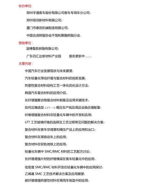 我们热忱欢迎高铁、轻轨、汽车及零配件企业,复合材料制品及原材料企业,模压设备企业等报名参加,五月相约郑州,共同商讨推进我国制造业健康快速发展!