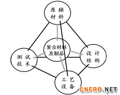 复合材料既是材料、又是结构和制品,原辅材料是复合材料制品的基本组成部分,是复合材料及制品性能的基础;设计与结构决定着复合材料制品性能的优劣,设计的本质是设计者能将自己对原辅材料、成型方法很好的融入到复合材料制品中,是复合材料及制品的关键;工艺方法及设备是将原材料按照设计思想转变为产品的过程,是连接原辅材料、结构设计成为复合材料及制品的桥梁,成型工艺方法决定原辅材料、结构在复合材料及制品中性能的发挥;测试方法是评价材料、结构、制品是否满足技术要求的保障。