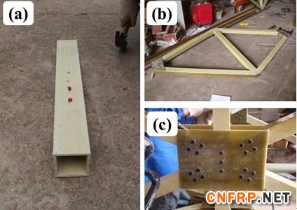(a)拉挤型材、(b)预制成型框架、(c)复合材料连接夹板及连接