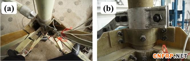 由矩形截面型材组成的三角结构框架,同拉挤管主材组成的垂直立柱的连接如图5所示,可以看到,内外连接板与结构框架通过螺栓连接,同时内外连接板同主材立柱形成大面积的包覆夹持连接,通过内外夹板将主材立柱与结构框架连接为整体结构。实际的产品连接结构如图6所示。
