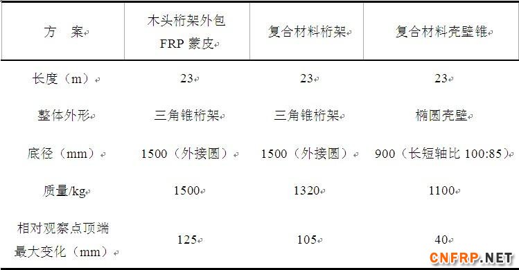 将设计为椭圆截面锥杆方案的测试臂与传统设计的三角锥桁架方案进行对比,技术参数如表1所示,可以看到,椭圆锥杆方案得到的产品底径小,自重轻,顶端的轨迹精确度高。