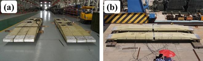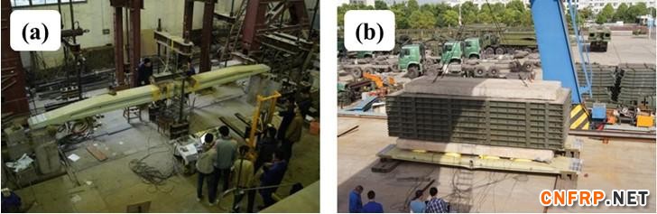 图19 复合材料桥梁静载实验:(a)四点弯曲测试;(b)静态加载测试