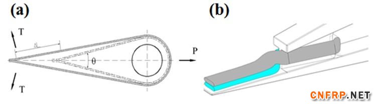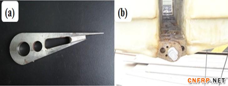 由于铰接结构处存在巨大的局部应力,并需要很高的配合精度,因此铰接接头采用金属接头来实现复合材料桥片间的对接。如图17(a)所示,对于固定形态的金属接头,接头的角度对接头与玻璃钢部件间的劈裂力影响显着,接头角度越小,相同载荷下的劈裂力降低,但接头部分的质量将会显着增加。在控制劈裂力的同时,接头也要考虑减重设计,实际的设计方案如图17(b)所示,实际的铰接接头照片和配合工作照片如图18所示。