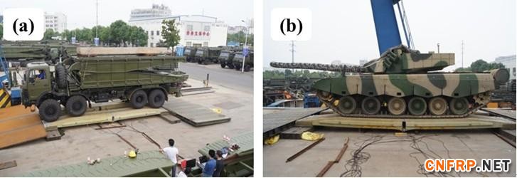 图20 复合材料桥梁的动载荷测试:(a)轮式动载测试;(b)履带式动载测试
