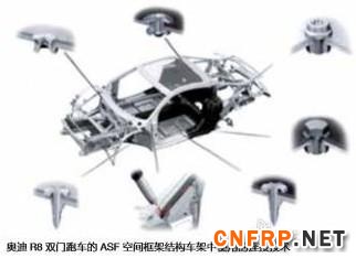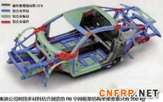 借助于多材料结构方案使得新型奥迪R8轿车的空间框架结构车架只有200kg,强度提高了40%,但重量却比原来减轻了15%。这一ASF空间框架结构车架79%的材料是铝合金,13%的材料是CFK碳纤维增强材料。