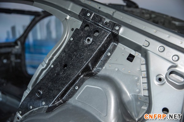 CFRP板被铆接在B柱上起加固作用,C柱则与SMC(Sheet Molding Compound)板铆接在了一起。SMC是热固性树脂含浸于碳纤维中制成片材后,使用冲压机进行加压和热固化制作的预浸材。