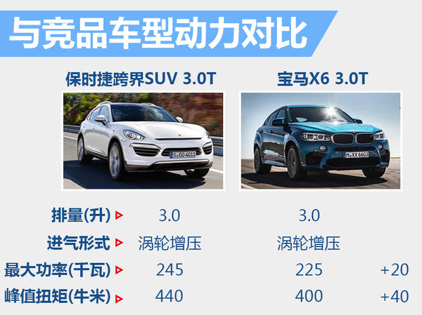 在豪华大型跨界SUV市场中,宝马旗下的X6车型是该领域的开辟者,而保时捷也将推出旗下款跨界SUV车型,新车上市后将进入这一细分市场。以同为3.0升排量车型为例,保时捷跨界SUV的大功率可达245千瓦,峰值扭矩方为440牛米。而宝马X6的大功率和峰值扭矩在数据方面均略逊于前者。