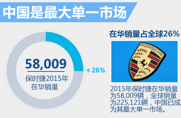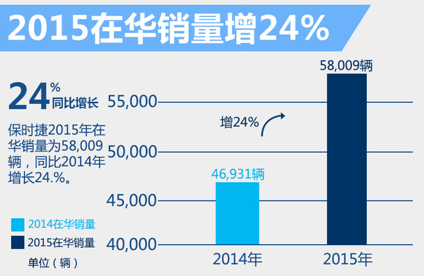 2015年全年保时捷在华销量为58,009辆,较2014年的46,931辆,同比增长24%。根据保时捷官方公布的数据,2015年保时捷累计交付销量为225,121辆,较2014年同期的189,849辆,同比大涨19%。保时捷在华销量已占到其销量的26%,目前已经成为保时捷大单一市场。随着全新跨界SUV产品的推出后及时入华,将助力保时捷销量的进一步攀升。