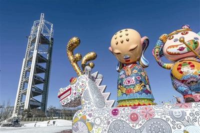 在奥林匹克公园亮相的是一组以名着《西游记》师徒四人为原型的大型彩雕,内容包括长达8米的白龙马,其上载着唐三藏、孙悟空、猪八戒、沙悟净,高度超过3米;在地坛公园亮相的则是一只4米巨型不锈钢烤漆作品“马上封侯”,既应景又喜气。