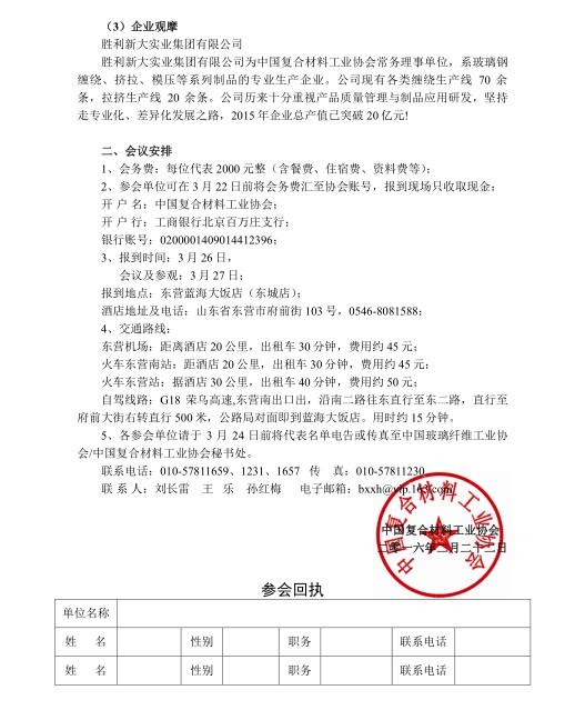 5、各参会单位请于3月24日前将代表名单电告或传真至玻璃纤维工业协会/复合材料工业协会秘书处。