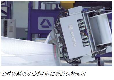 自动铺层:铺层材料仍为玻纤布和碳纤维布,兼容单轴、双轴、三轴等各类纤维。布料以料辊形式存储在料辊库里,铺头按程序要求自动从库中抓取相应的料辊进行铺层。料辊长度(即单辊布幅宽度)范围为100mm至800mm(亦可按实际需求设计更长)。可对模具上任何部位进行铺层,包括根部、主梁、后缘、前缘、填充前、填充后等,从而在模具内自动完成叶片的全部铺层;叶片曲线部位的铺层通过实时随形剪裁实现。铺层可通过自动精准施加增粘剂来固定。各层之间的定位-间隙/搭接-通过光学照相系统自动控制和调整。