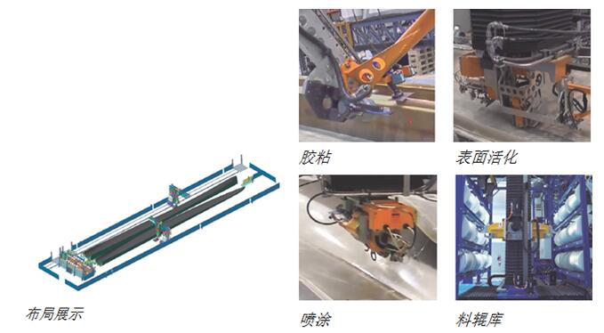 自动施胶:施胶部位包括主梁、腹板和法兰边等,施胶能力为35kg/分钟。35米叶片约15分钟完成施胶,70米叶片约30完成施胶。