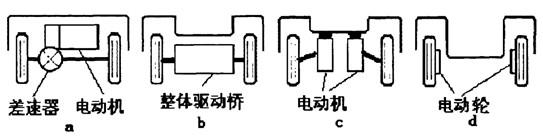 从下图的比较可以看出,在a、b、c和d四种驱动形式中,电动轮驱动形式的结构简单、紧凑,所占用的空间是少的,这不仅可以提供更大的乘坐空间,还降低车厢底板,使汽车的重心大大降低,提高了汽车的稳定性。