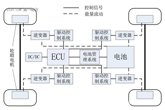 轮边驱动单元,按照驱动形式可以分为四轮轮边驱动型、2常规驱动轮+2轮边驱动轮、2前轮短半轴加轮谷电机+2后轮轮边驱动和4轮短半轴加轮毅电机形式。比如,下图就是一种采用2前轮短半轴加轮毂电机+2后轮轮边驱动形式的电动车的结构示意图。