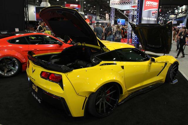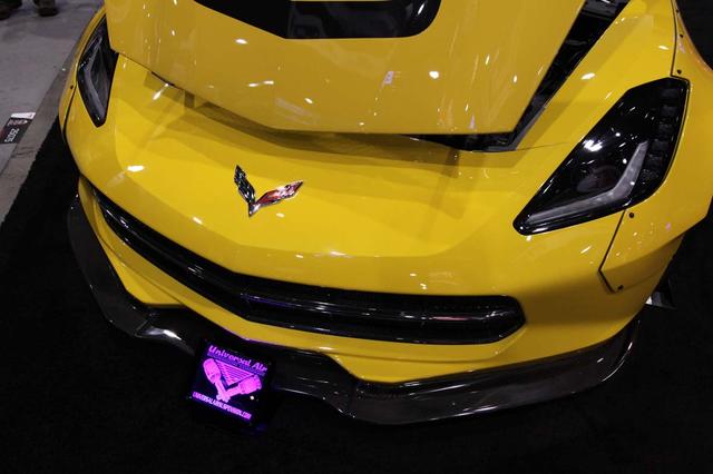 专门为Muscle Car推出碳纤维套件的TruFiber,除了今年相当火红的Mustang之外,其实也推出许多其它肌肉车专用的套件,像这辆Chevrolet C7 Corvette Stingray也是TruFiber非常主力的车型。在2014年SEMA Show,TruFiber就曾以C7 Corvette Stingray为基础展示旗下碳纤维产品,而今年也是以一辆黄色C7 Corvette Stingeay再次展示其碳纤维制品,乍看之下,这两辆车相当雷同,不过今年这辆Demo Car多了车身宽体。对应C7 Corvette Stingeay的碳纤维套件相当丰富,诸如前下扰流板、气坝格网、叶子板散热孔、车身侧裙、尾翼等,装在黄色车身上极为醒目,另外就是四轮超大车身宽体,其它像是发动机饰盖、保险丝盒的盖子等,也都会推出对应的碳纤维制品。