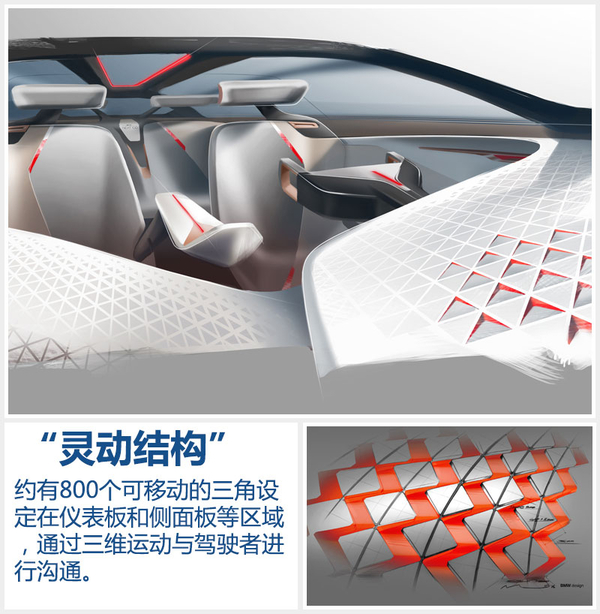 “BMW VISION NEXT 100”概念车应用了名为“灵动结构”的全新技术,约有800个可移动的三角设定在仪表板和侧面板等区域,通过三维运动与驾驶者进行沟通。车外“灵动结构”展示出的效果是在车轮转向过程中,无论处于何种位置,车身始终能像一层柔软的皮肤一样包裹住车轮。