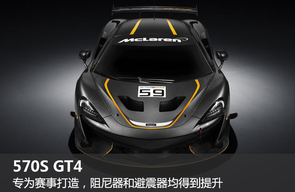 在迈凯伦2款新车中,570S GT4将参加本年度举办的英国GT锦标赛,共9场分站比赛,轮则是英国GT赛事,并且于4月16-17日进行。其中,570S GT4是由迈凯伦赛车研发部门全力打造的车款,而570S GT4则专为各项赛事而打造的工厂赛车,新车的悬挂系统与避震器均经过针对性的升级,并配备有单螺母设计的镁合金轮毂,以及由国际汽联所认证通过的全车防滚架。