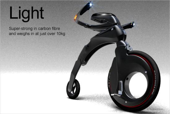 利用碳纤维复合材料作为主体材料,总重量仅为10.8公斤,高时速可达23公里/小时,只需不到20秒的时间就能折叠至轻松手提的状态,引人注目的是它非常炫酷的创新外观设计,这就是Yike bike。