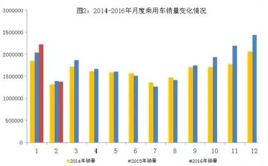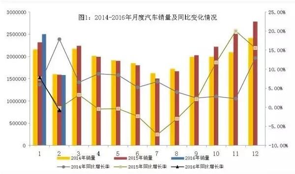 2016年2月,我国汽车产销市场较上月明显下降,同比略有下降。1~2月汽车产销略高于上年同期。