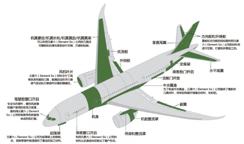 图2 元素六公司性能卓越的研磨材料能用于多种复杂飞机部件的有效加工——图中绿色部分所示。