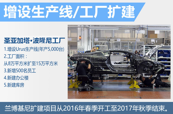圣亚加塔·波隆尼工厂的面积目前为80,000平方米,将扩建到150,000平方米,并增加第三条生产线打造款SUV车型(另外两条生产线则分别生产Aventador和Huracan车型),年产量将达到5,000台。此外,兰博基尼还将增加雇佣500名新员工。