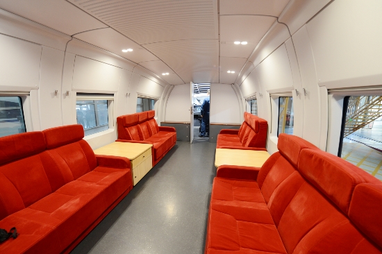 时速350公里高寒综合检测列车基于CRH380BG型高寒动车组平台研制。列车上安装了弓网、轨道、动态响应等高精度检测设备,能够实时检测基础设施和车辆高速行驶的技术参数,为线路日常维护提供指导和数据支撑。同时,为了满足检测人员生活、工作需求,车辆内装进行了大量改动,设置了工作车、餐车、卧铺车、会议车。列车转向架设计是一大难点,在增加轨道检测梁、检测设备接口的同时,要适应结构强度和疲劳寿命的需求。