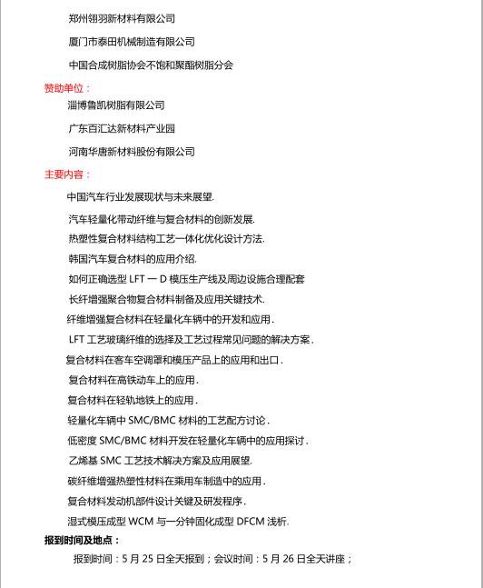 我们热忱欢迎高铁、轻轨、汽车及零配件企业,复合材料制品及原材料企业,模压设备企业等报名参加,五月相约郑州,共同商讨推进我国制造业健康快速发展!
