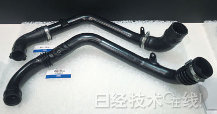 汽车的耐热导风管使用树脂也减轻了重量(图2)。由经营吹塑成型品的爱克赛尔(EXCELL,总部:东京)使用东洋纺供应的树脂生产。与以往的耐热导风管相比,重量大约减轻了40%。已经在富士重工业汽车中投入实用。