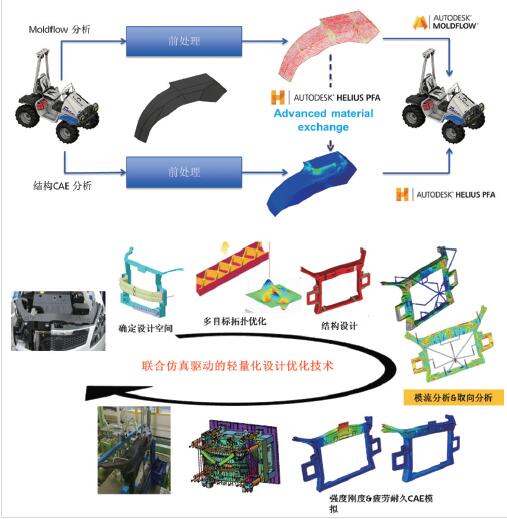 基于客户在轻量化方面的仿真需求,欧特克公司构建了以Autodesk Mold?ow深 层次注塑成型分析为核心,结合Autodesk CFD先进的流体及热分析,Autodesk Simulation Mechanical + Autodesk Nastran专业的结构及力学分析,Autodesk Helius PFA符合材料设计及验证分析的多工况和多物理场的联合分析解决方案。特别是针对纤维填充塑料和复合材料,通过 Helius PFA 及其AME接口,可轻松的将Mold?ow分析所获得的塑料制品在成型过程中产生的残余应力以及材质属性转入到结构分析软件中(同时支持Abaqus,Ansys)进行进一步的结构优化和性能验证。并创新性的实现了异步的工作流程,极大的提高了联合仿真的分析效率。