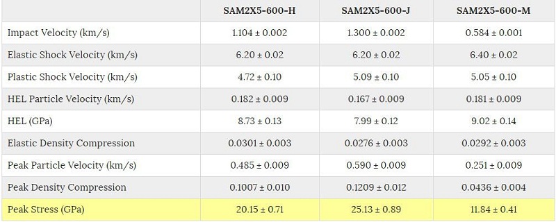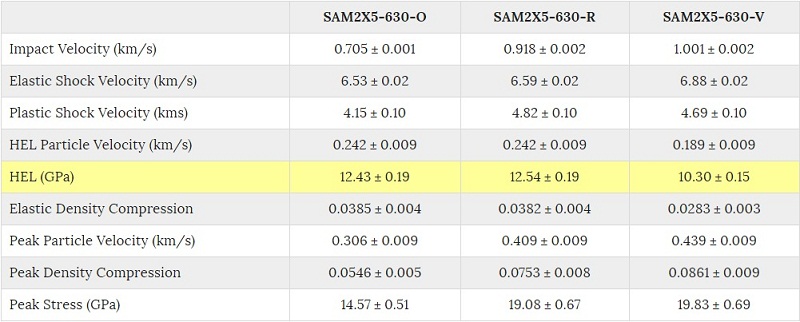 测试结果发现,SAM2X5-600和SAM2X5-630的HEL分别为8-9Gpa和10-12.5Gpa,对应于弹性应变3%和4%。SAM2X5-630的HEL几乎是之前见诸报道的金属玻璃的1.5倍(后者不超过7Gpa)。