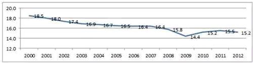 欧盟工业产值占总产值比重,2000-2012