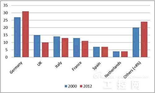 工业4.0,只是德国的。除此之外的欧洲,仍然是工业4.0前夜。欧盟内部关于工业4.0的认识,众说纷纭,莫衷一是。本报告编译自欧盟议会下属的智库,它列出了欧盟工业4.0的成熟度分析,重点考察了工业4.0倡议的可能性和带来的商业范式的变化,并深刻地评估了政府干预的逻辑链。欧盟制造业的1+N格局欧盟制造业现状总体可以概括成以下两个方面:在内部: 制造业地位依然重要;但占总产值比例下降;各成员国制造业分化严重。在外部:竞争力仍然;但制造业向新兴经济体转移,外包;份额加速下降。在欧盟内部,约200多万家制造企业,提供了总就业人口的20%。而这些企业中的一大部分为中小型制造企业。尽管制造业的地位如此重要,但欧盟工业产值占总产值比重呈总体下降趋势。该比重由2000年的约18%下降到2009年的谷底约14%,后逐渐恢复到2012年的约15%。